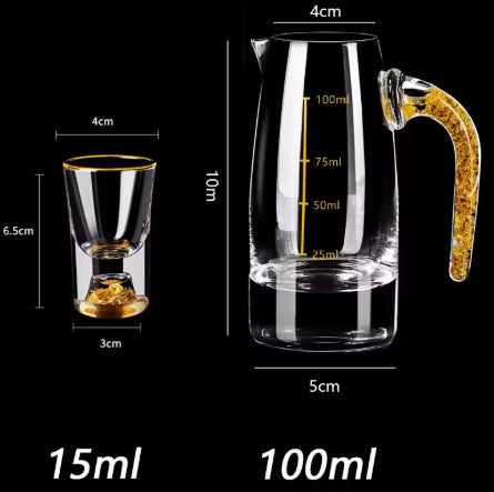 O design ergonômico dos copos, combinado com a transparência cristalina do material, proporciona uma experiência sensorial única, onde a luz reflete suavemente nas superfícies douradas, criando um espetáculo visual encantador. Cada peça é uma celebração de elegância e requinte, ideal para momentos de celebração e contemplação.