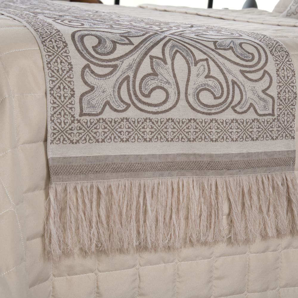 A padronagem geométrica, rica em cores e texturas, é perfeita para criar um ambiente moderno e acolhedor. Já as franjas nas extremidades da peseira adicionam um toque rústico e elegante — um detalhe tendência que eleva o visual da cama. Todos os itens são dupla face, garantindo versatilidade para diferentes composições, inclusive em sofás e poltronas.